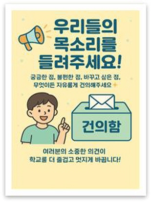 서울수명초등학교(교장 조성복)에서는 9월 학생자치회 활동 주제는‘독서’입니다. 이와 관련하여 9월 8일부터 30일까지‘책 읽고 인상적인 장면 그리기‘와’책 제목으로 N행시 짓기‘ 행사가 진행되었습니다. 우수 작품은 선정하여 게시판에 게시하고 상품을 전달할 예정입니다. 더불어 전교 임원 공약인 ‘건의함’이 설치되었습니다. 학생 여러분의 소중한 의견은 한 달에 한 번 확인하여 학교에 전달할 예정입니다. 또한‘양말대여’공약 실천을 위한 양말도 준비되었습니다. 비가 많이 오는 날 양말이 젖으면 전교 부회장에게 양말을 대여할 수 있습니다.
