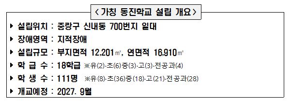 ▢ 서울특별시교육청(교육감 정근식)은 오는 10월 22일(수) 오전 10시30분, 중랑구 신내동 700번지 일대 신축 부지에서‘(가칭)동진학교 신축공사 기공식’을 개최한다.