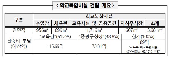 〇 학교는 학생들의 교육활동 공간인 교사동 외에, 지역주민이 함께 이용할 수 있는 학교복합시설을 중랑구청과 협력*해 건립한다. 학교복합시설은 연면적 3,981㎡, 지하 1층, 지상 3층 규모로 △수영장 △체육관 △평생교육센터 △도서실/카페테리아 등이 설치된다.