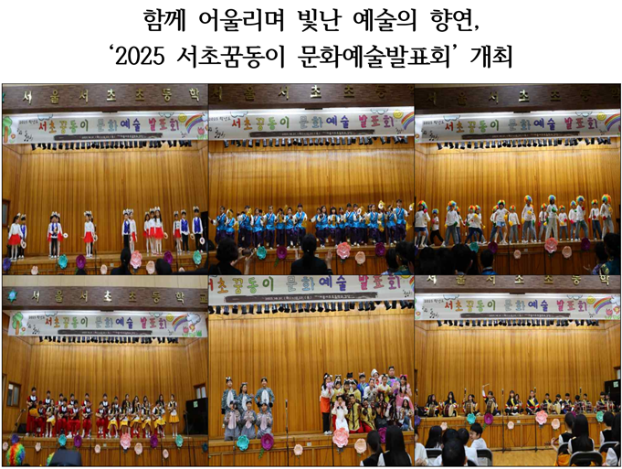 이번 문화예술발표회를 통해 학생들은 협력과 자신감, 그리고 예술의 즐거움을 배우는 소중한 경험을 했습니다. 앞으로도 서초초등학교는 학생들의 다양한 재능을 발휘하고 함께 성장할 수 있는 교육활동을 지속적으로 지원할 계획입니다.
