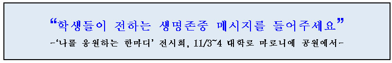 ▢ 이번 전시는 지난 9월 진행된 ‘세계 자살 예방의 날 기념 캠페인’에서 학생들이 직접 작성한 생명존중·자기존중 문구를 바탕으로 마련되었다. 참여 학생은 약 900명이며, 이 중 창의성과 진정성이 돋보인 50개 문구가 최종 선정되어 전시된다.