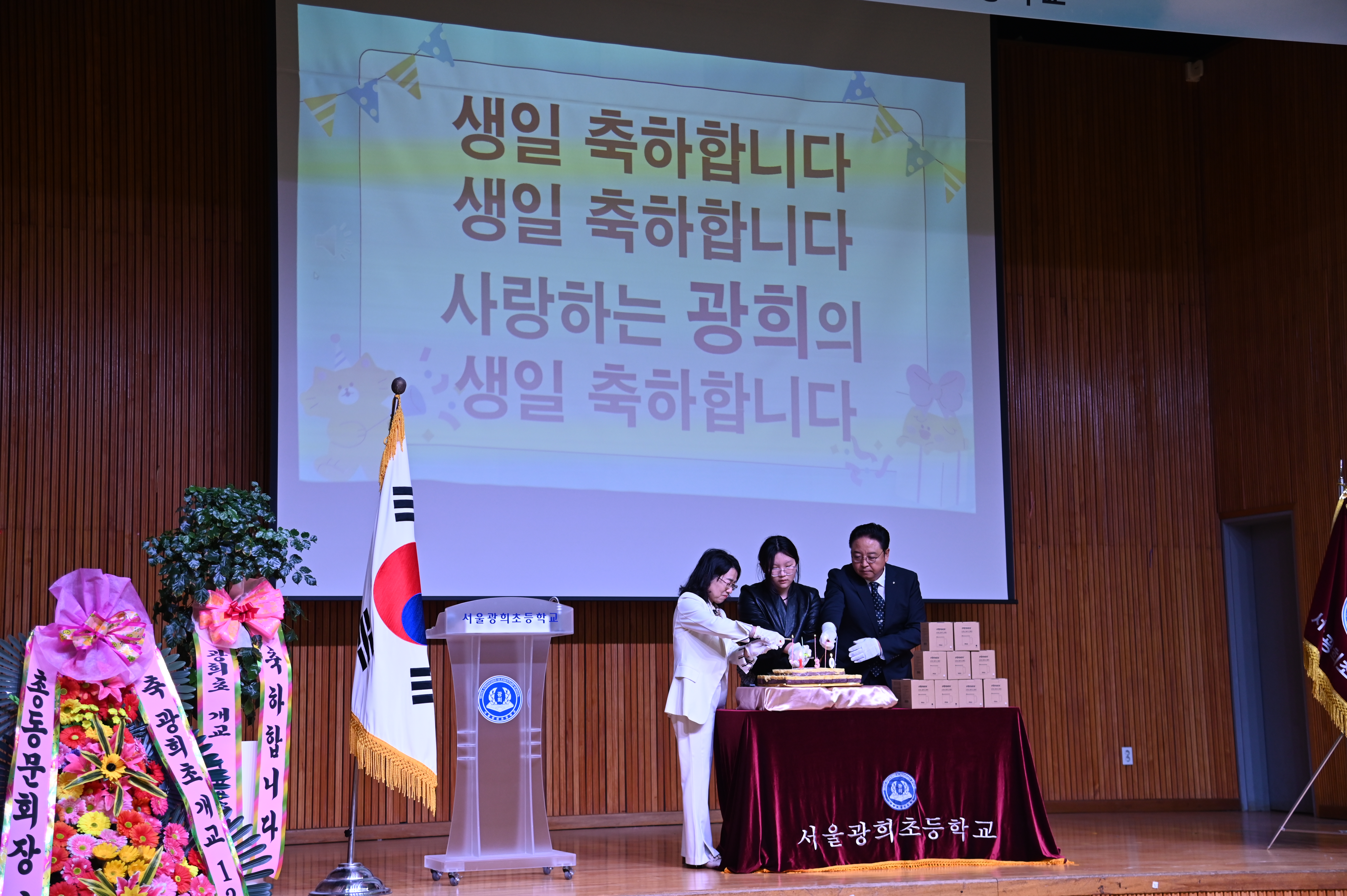 130주년 축하 커팅식으로 기념식을 마무리하였습니다. 학생들은 개교 130년이 되는 학교에 다니는 것을 자랑스럽게 여기고, 학교 교훈처럼 “바르고 슬기롭고 건강하게” 학교생활을 하면서 광희초의 200년을 향해 역사와 전통을 만들어 갈 것 다짐하였습니다