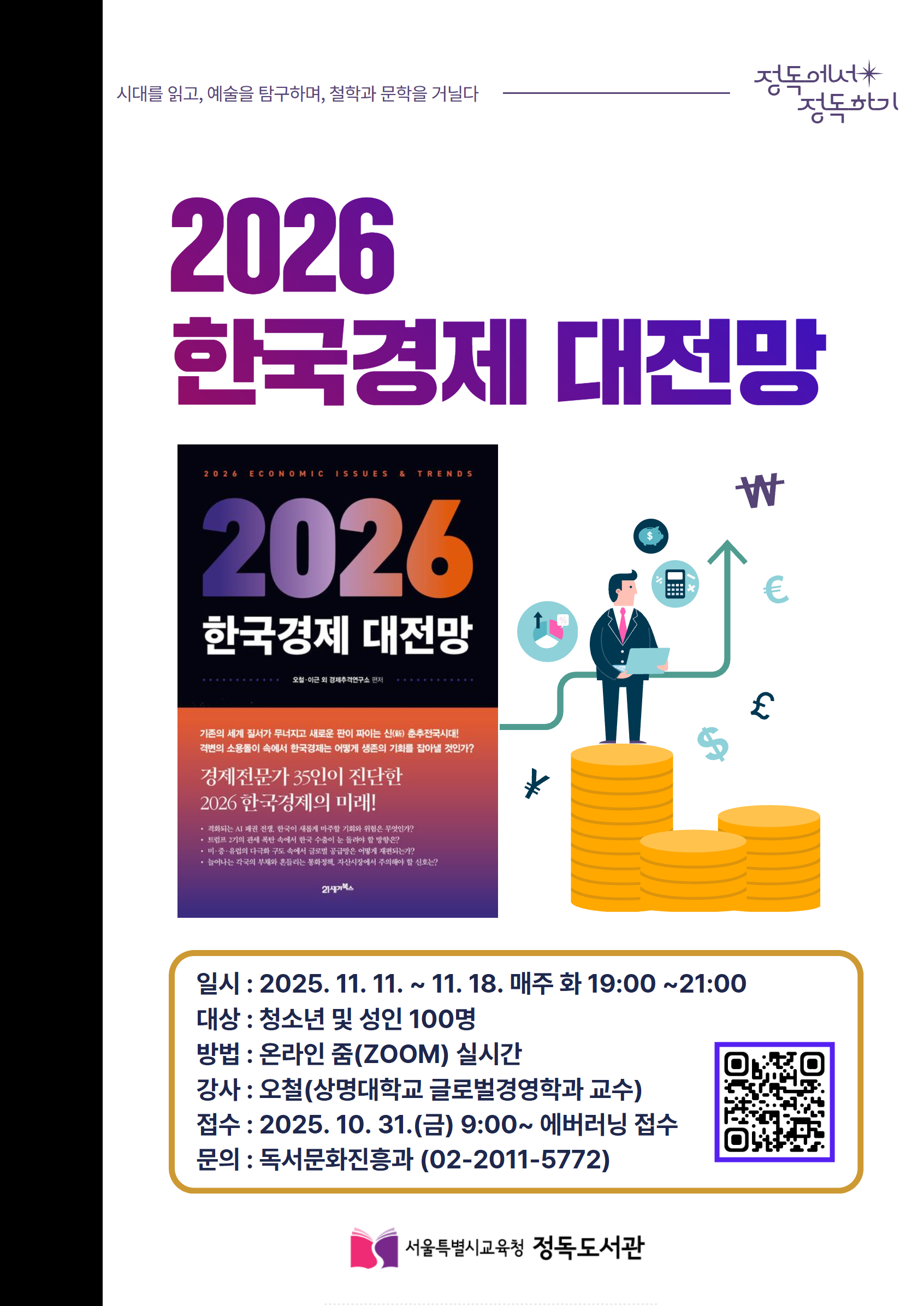 □ 서울특별시교육청정독도서관(관장 엄동환)은 오는 11월 11일(화)과 11월 18일(화) 저녁 7시부터 9시까지, 시민을 위한 경제 특강 <2026 한국경제 대전망>을 운영한다.