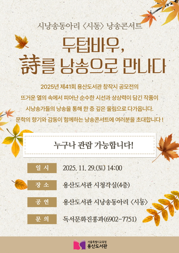 ▢ 서울특별시교육청 산하 용산도서관(관장 박경옥)은 오는 11월 29일(토) 오후 2시, 4층 시청각실에서 「두텁바우, 시를 낭송으로 만나다」 시낭송 콘서트를 개최한다.