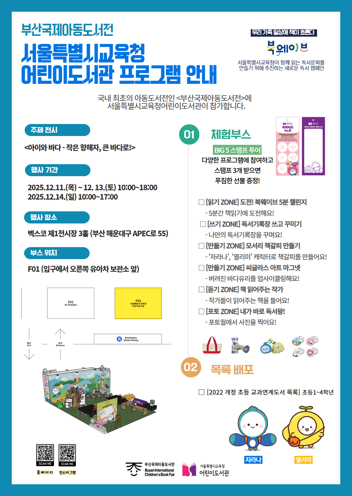 ▢ 서울특별시교육청어린이도서관(관장 김진승)은 오는 12월 11일부터 14일까지 부산 벡스코에서 개최되는 ‘부산국제아동도서전’에 참가한다.