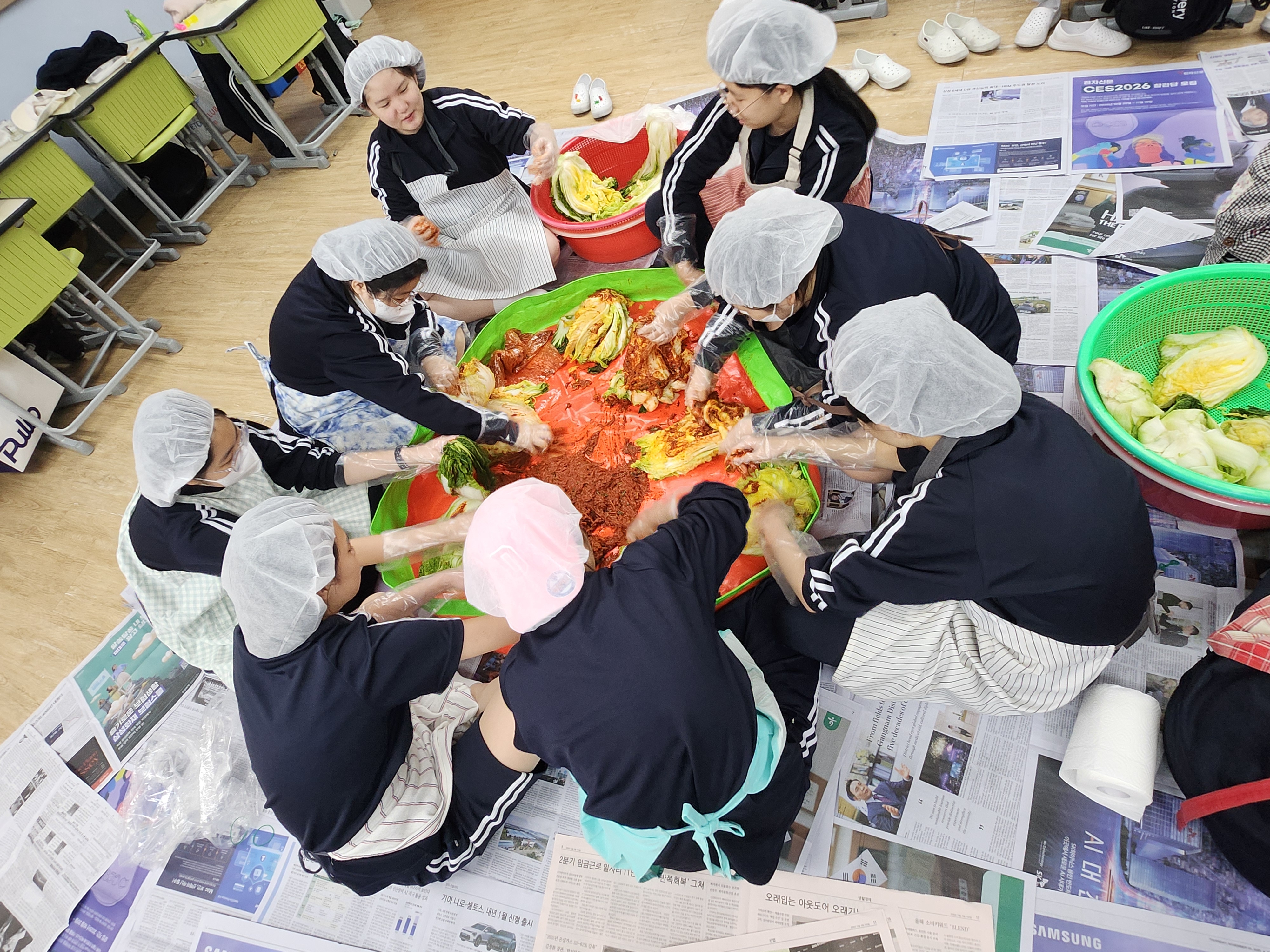이날 학생들은 교실에 김장 매트를 깔고 조별로 모여 배추를 다듬고, 준비된 양념을 골고루 바르며 김장 김치를 완성했다. 위생모와 앞치마, 장갑을 갖춰 입은 학생들은 처음에는 서툴렀지만, 곧 능숙한 손놀림으로 서로 도와가며 김장에 집중하는 모습을 보였다.