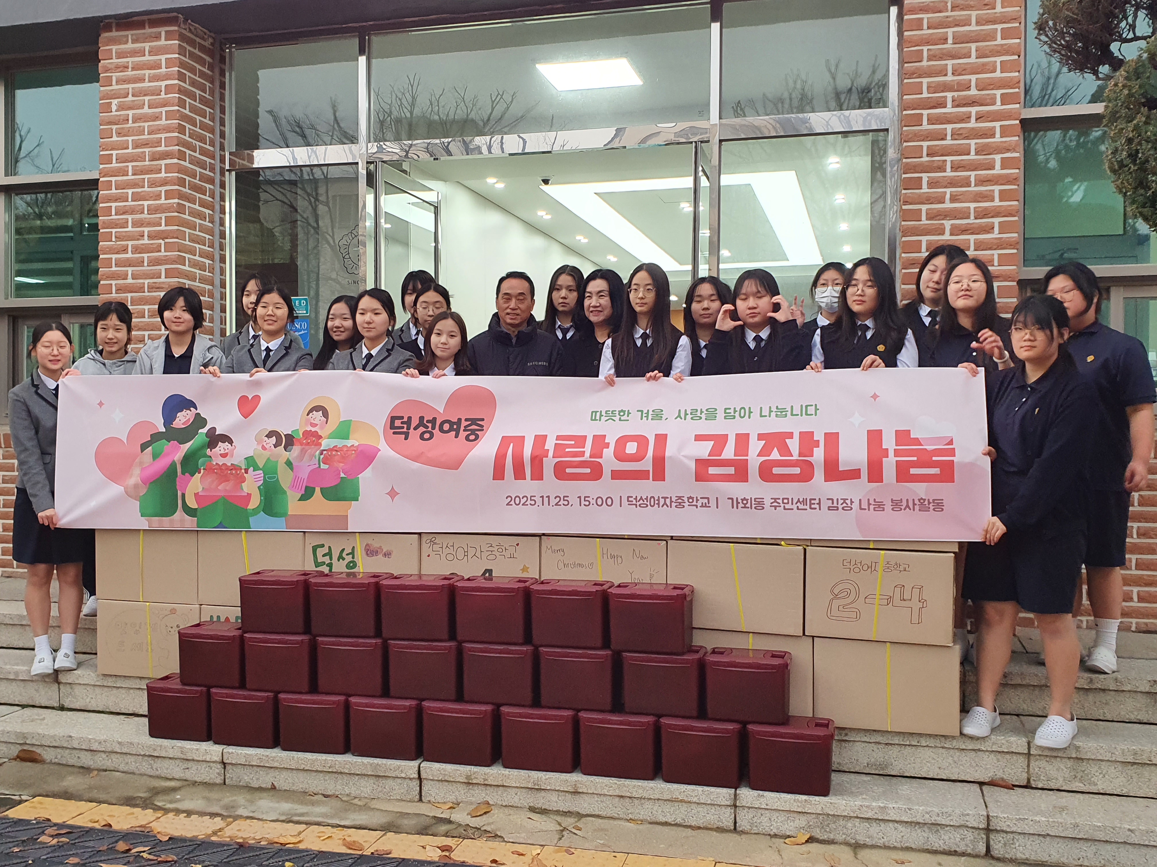 지난 11월 25일, 덕성여자중학교에서 학생들이 직접 김장을 하여 이웃과 나누는 김장체험활동을 진행하였다. 이번 활동에는 전교생 150 여명의 학생과 교사들이 참여해 우리 전통 음식인 김치의 소중함을 배우고, 나눔을 통해 이웃 사랑을 몸소 실천했다.