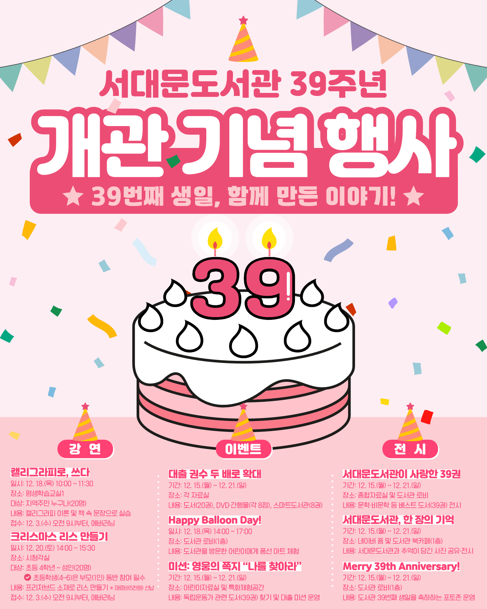 ▢ 서울특별시교육청(교육감 정근식) 서대문도서관(관장 노귀례)은 오는 12월 15일부터 21일까지, 7일간“39번째 생일, 함께 만든 이야기!”라는 슬로건 아래 개관 39주년 기념 행사를 진행한다.