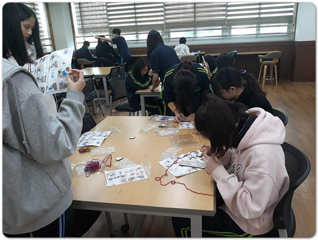 첫 번째 행사인 ‘직조 위빙 책갈피 만들기’는 날실과 씨실을 활용해 직접 책갈피를 제작해 보는 체험 활동으로, 학생들의 큰 관심을 받았다. 학생들은 고정틀에 실을 묶은 뒤 플라스틱 바늘을 이용해 실을 엮어 위빙 작업을 진행하였으며, 아래위 교차 방식으로 실을 끼운 후 나무빗으로 정리하며 바느질을 완성했다. 이후 여러 색의 실로 디자인을 꾸미고 고정틀의 실을 매듭지어 책갈피를 완성하였다. 참여 학생들의 호응이 높아 행사 물품이 조기에 소진되기도 했다.