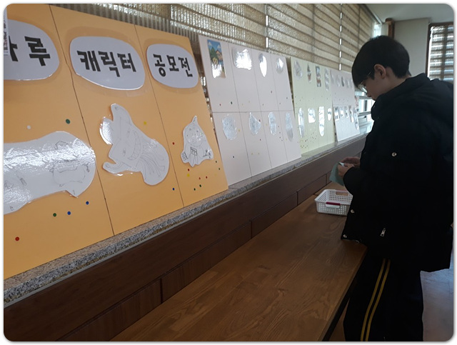 두 번째 행사인 ‘캐릭터 공모전’은 11월 17일부터 11월 23일까지 작품을 접수하였으며, 더 많은 참여를 독려하기 위해 11월 28일까지 접수 기간을 연장하였다. 접수된 작품은 12월 5일과 12월 8일 이틀간 교내에 게시되었고, 학생들이 직접 스티커 투표에 참여해 우수 작품을 선정하였다. 총 29점의 작품 중 1위 1팀, 2위 2팀, 3위 3팀 등 총 5팀의 작품이 선정되었다.