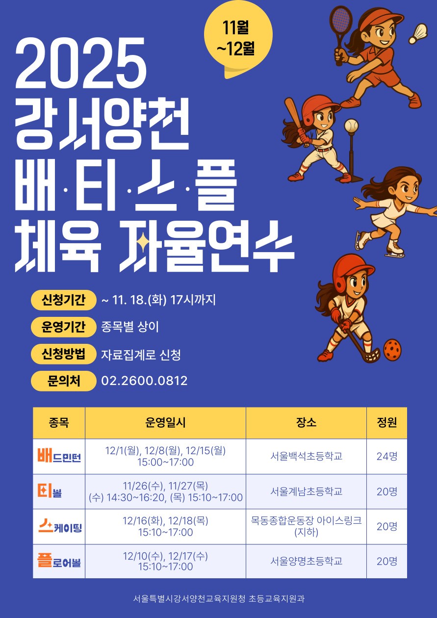 ▢ 서울특별시교육청(교육감 정근식) 산하 강서양천교육지원청은 관내 초등학교(특수학교) 교원의 체육수업 및 학교스포츠클럽 운영 역량 강화를 위해「2025 강서양천 배드민턴·티볼·아이스스케이팅·플로어볼(배·티·스·플) 체육 교원자율연수를 운영한다.