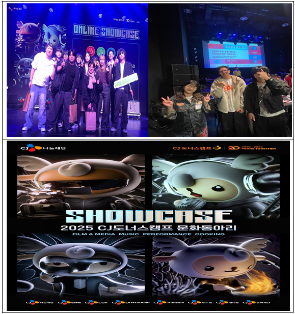 □ 2025 CJ도너스캠프 음악부문 어드밴스드 프로그램은 음원 제작 지원을 비롯해 버클리 음대 교수진의 전문 멘토링, AI 기반 창작 특강 등 실용음악 전공 학생들에게 실제적이면서도 수준 높은 학습 기회를 제공하였으며 특히 버클리 음대 카이미 마세 교수님으로부터 멘토링을 받은 정○진 학생은 “블루스 장르의 핵심이라 할 수 있는 그루브를 깊이 이해할 수 있었던 값진 시간이었다”며 이번 프로그램이 자신의 음악적 시야를 넓히는 데 큰 도움이 되었다고 소감을 밝혔다.