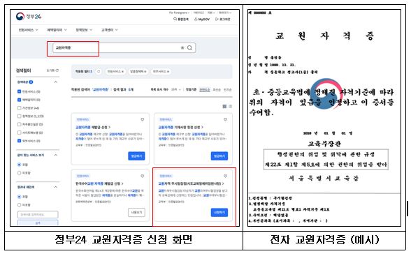 ▢ 신청자는 정부24 누리집에서 직접 무시험검정 교원자격증을 신청할 수 있으며, 발급된 전자 자격증은 프린터로 출력하거나 PDF 파일로 저장할 수 있다. 또한 온라인 제3자 제출도 가능해 신청 및 활용 편이성이 크게 향상될 것으로 기대된다. 무시험검정 교원자격증 전자 발급에 대한 자세한 안내는 서울시교육청 누리집에서 확인할 수 있다.