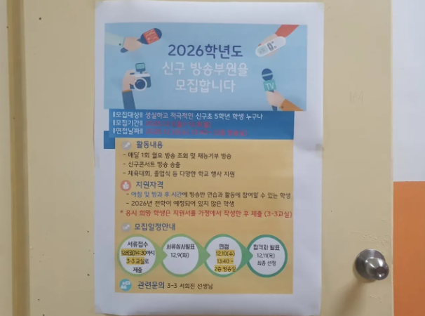 12월 1일부터 11일까지 신구초 5학년 학생을 대상으로 2026학년도 방송부원 모집이 진행되었습니다. 방송부는 월요방송, 신구콘서트, 각종 학교 행사 지원 등 다양한 역할을 맡아 학교의 소통 창구 역할을 하게 됩니다. 선발된 방송부 학생들이 성실하게 역할을 다하여 협력과 책임의 가치를 배우기를 기대합니다.