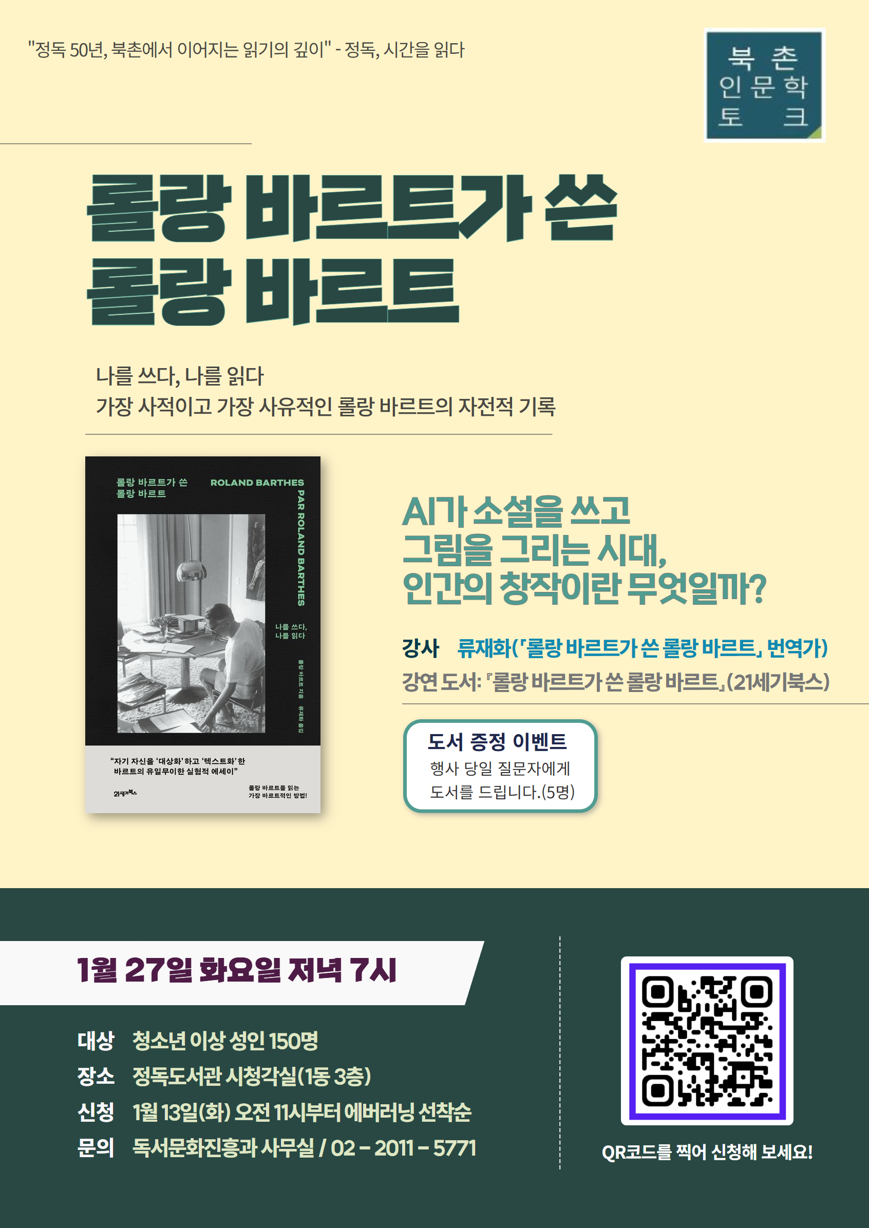 ▢ 서울특별시교육청(교육감 정근식) 산하 정독도서관(관장 엄동환)은 시민의 인문학적 성찰과 사유 역량 강화를 위해, 「북촌 인문학 토크 : 롤랑 바르트가 쓴 롤랑 바르트」를 오는 1월 27일 개최한다.