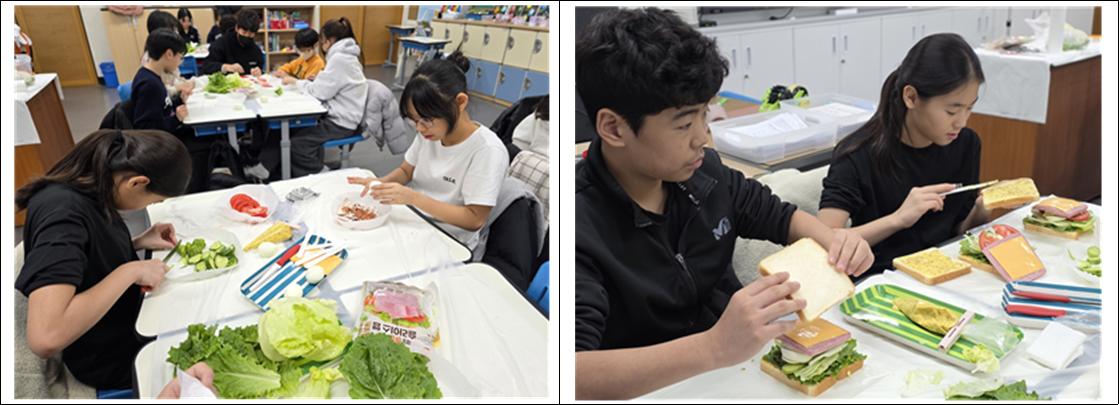 체험에 앞서 강사님께서 샌드위치를 만드는 과정과 위생의 중요성에 대해 충분히 설명해 주셨고, 학생들은 진지한 자세로 설명을 듣고 활동에 참여하였습니다. 특히 강사님께서는 “내가 좋아하는 샌드위치가 아니라, 다른 사람에게 판매할 수 있는 샌드위치를 만들어야 합니다.”라고 말씀하시며 직업인으로서의 책임감과 마음가짐의 중요성을 강조하셨습니다. 완성된 두 가지 샌드위치는 맛과 모양 모두 뛰어나 학생들로부터 좋은 반응을 얻었으며, 체험에 참여한 학생들 모두 즐겁고 만족스러운 시간을 보냈습니다. 이번 파티쉐 진로체험은 학생들이 자신의 적성과 흥미를 탐색하고 미래 직업에 대해 생각해 보는 소중한 기회가 되었습니다.