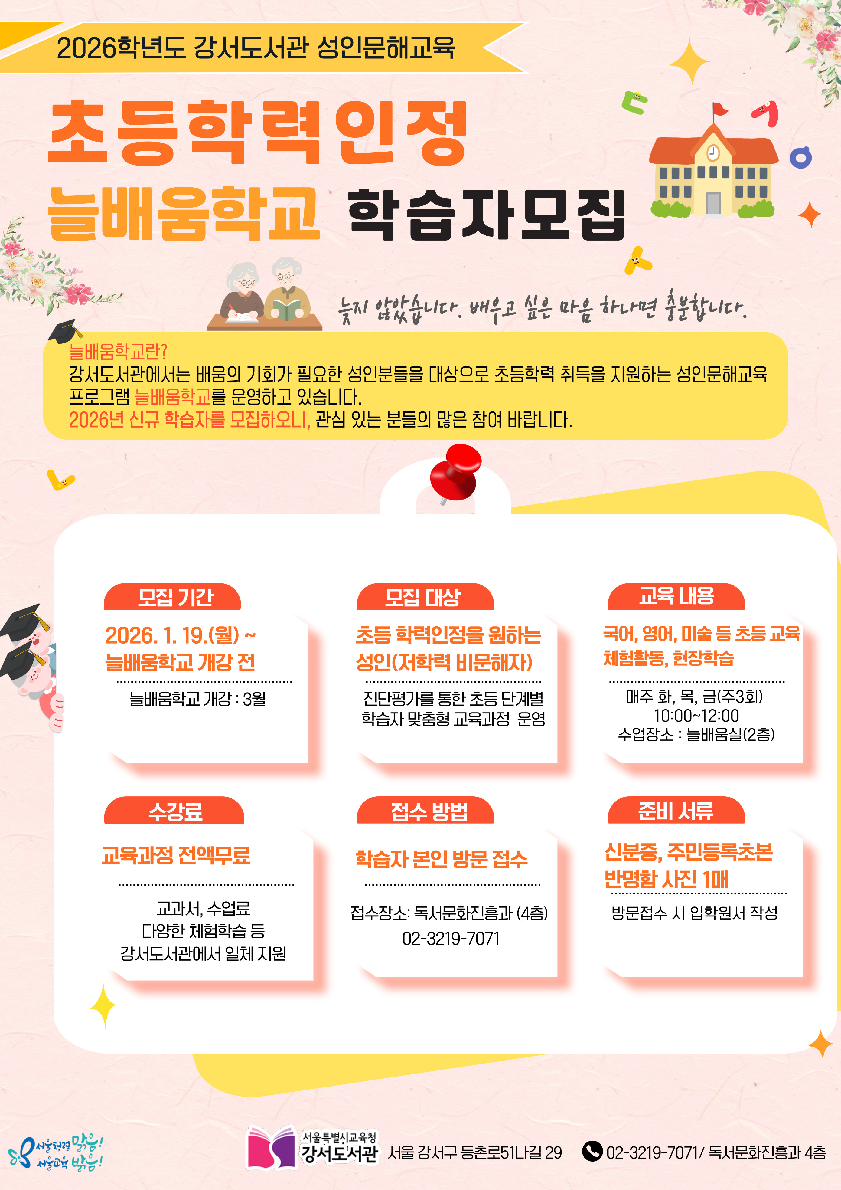 서울특별시교육청강서도서관은 배움의 기회를 놓친 성인들을 대상으로 초등 학력 취득을 지원하는 성인문해교육 프로그램인 늘배움학교의 2026학년도 신입 학습자를 모집한다.