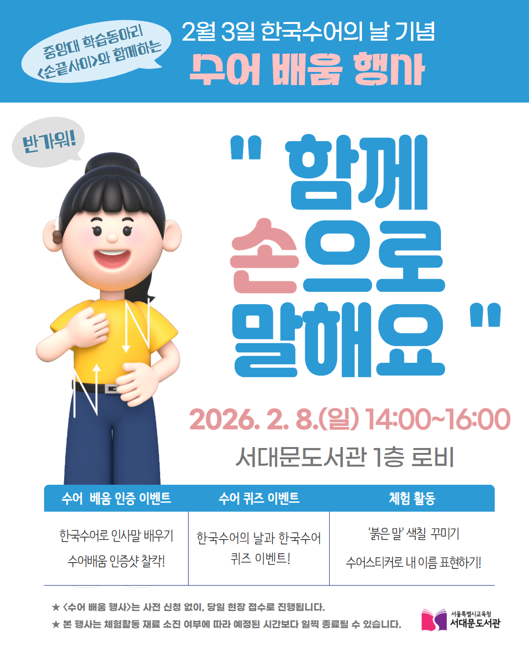 ▢ 서울특별시교육청(교육감 정근식) 서대문도서관(관장 노귀례)은 오는 2월 8일(일) 오후 2시부터 2026년 「한국수어의 날 기념 수어 배움 행사 “함께 손으로 말해요”」를 운영한다.