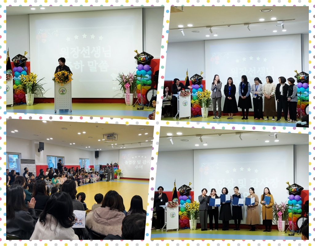 본 행사에서는 졸업생 60명의 당당한 입장을 시작으로 학사보고와 졸업장 수여가 이어졌습니다. 이번 수여식에는 유아들뿐만 아니라 성장을 함께 응원해 준 학부모님들께 전하는 감사장 수여가 포함되어 훈훈함을 더했습니다. 다음으로 축하와 회상의 시간이 이어졌습니다. 재원생 동생들의 깜찍한 축하 영상과 졸업생들이 직접 참여해 자신들의 꿈을 담아낸 ‘졸업영상’이 상영될 때마다 장내에는 미소와 감동이 교차했습니다.