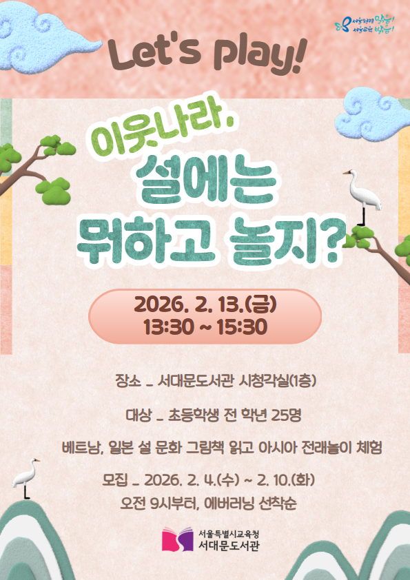 ▢ 서울특별시교육청(교육감 정근식) 서대문도서관(관장 노귀례)은 오는 2월 13일, 설 명절을 기념하여 다문화 프로그램 「이웃나라, 설에는 뭐하고 놀지?」를 진행한다.
