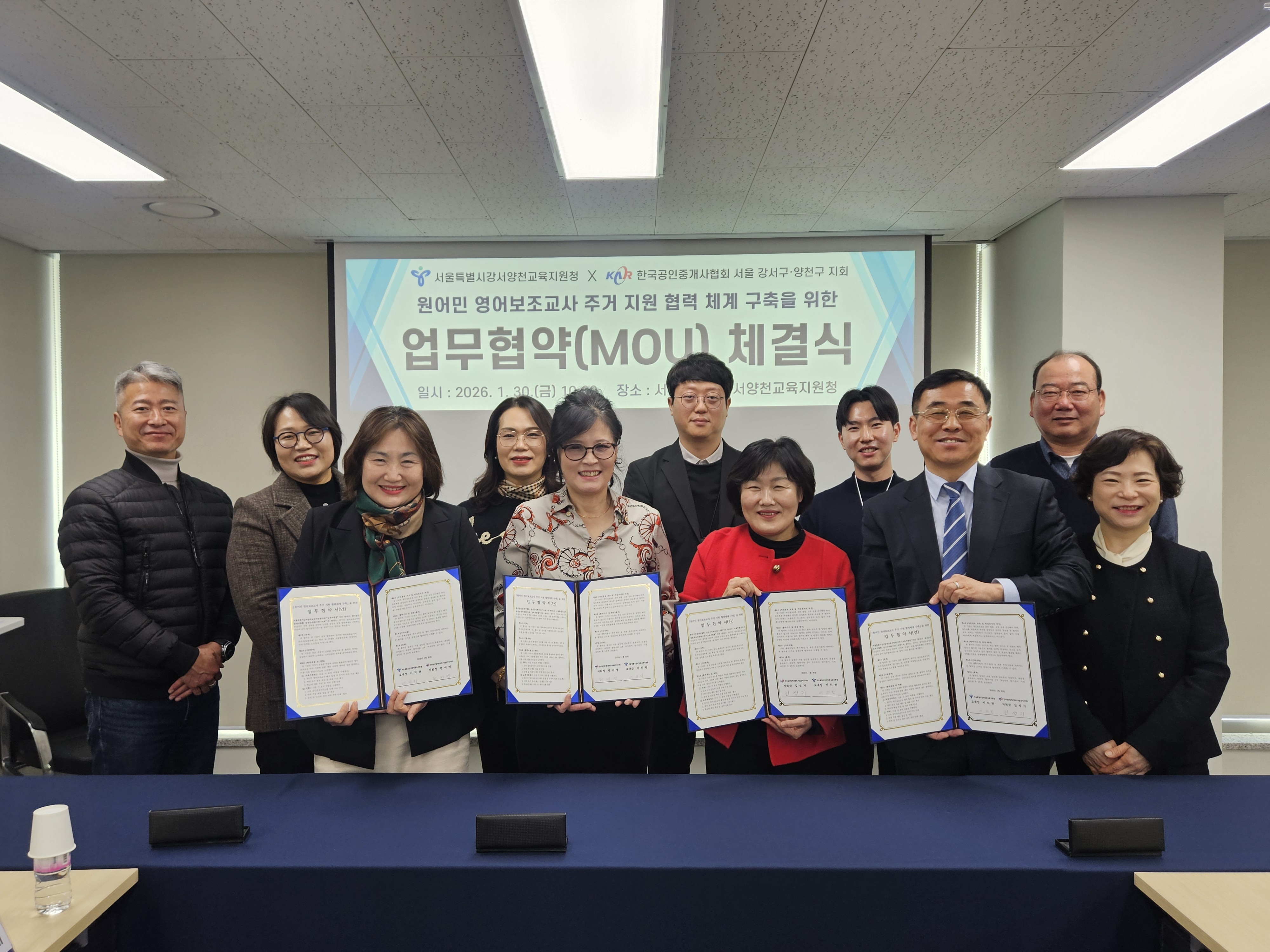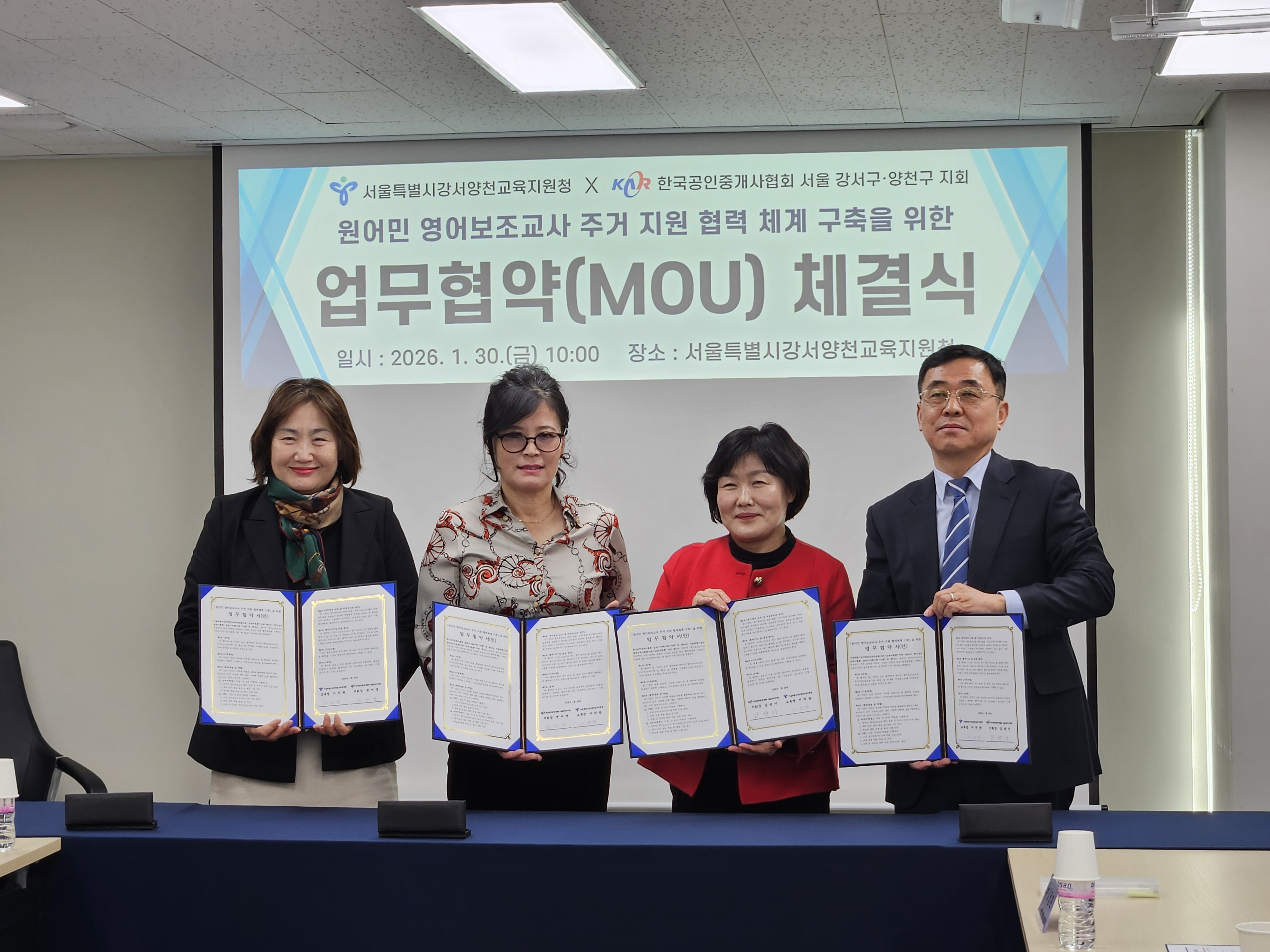 ▢ 서울특별시강서양천교육지원청(교육장 이의란)은 한국공인중개사협회 강서구지회(지회장 김성기)·양천구지회(지회장 편미영)와 관내 원어민 영어보조교사의 주거 지원 협력체계 구축을 위하여 2026년 1월 30일 강서양천교육지원청에서 업무협약을 체결했다.