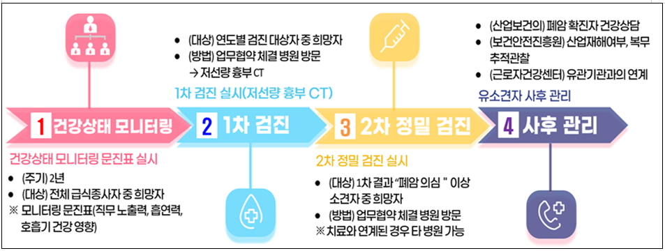 〇 협력병원은 △검진 대상자에 대한 요건 확인 및 1차 저선량 흉부 CT 검사, △‘폐암 의심’ 이상 소견자에 대한 2차 정밀검사, △검진 결과 상담 및 보고 등 학교 급식종사자의 폐암 검진 과정 전반에 대하여 협력하게 된다.