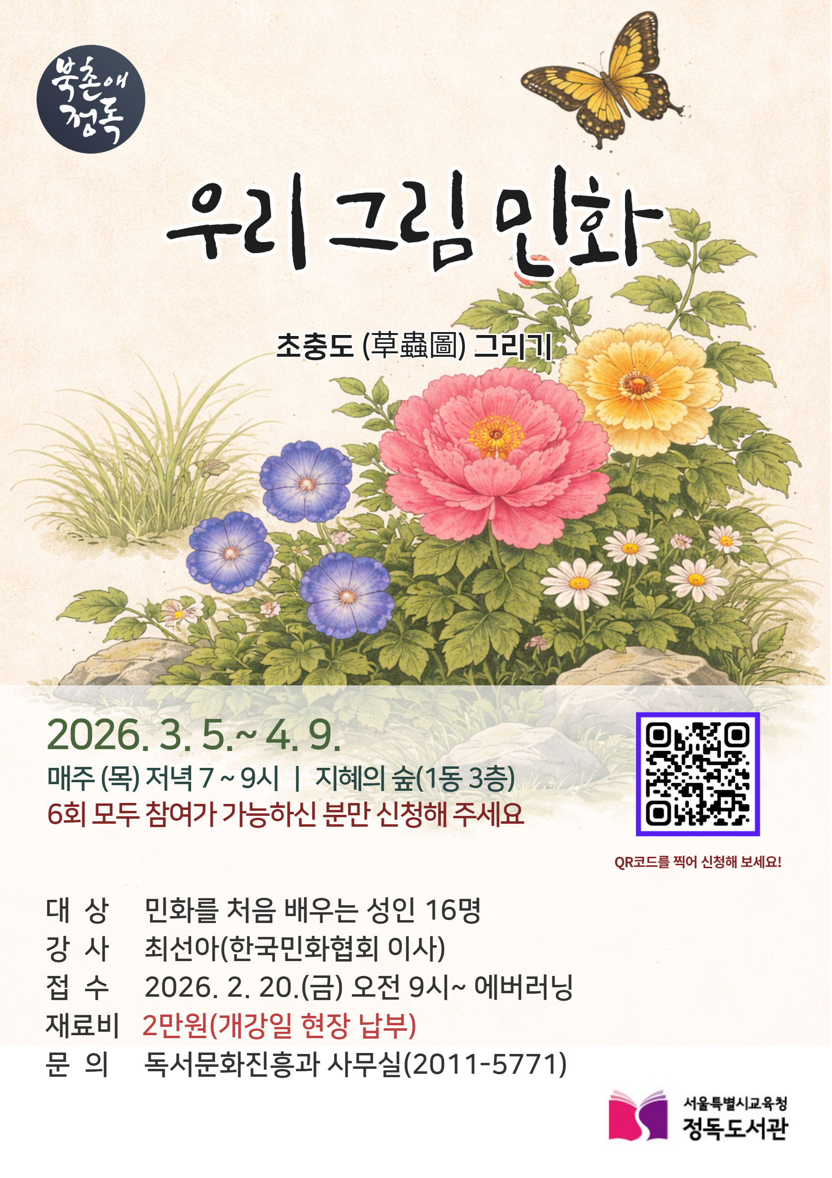 □ 서울특별시교육청(교육감 정근식) 산하 정독도서관(관장 엄동환)은 우리 전통 회화 문화 체험 기회를 제공하기 위해 「우리 민화 그리기(초충도)」 강좌를 3월부터 운영한다.