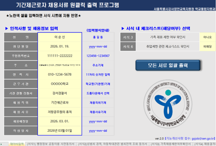 ▢ 서울특별시강서양천교육지원청(교육장 이의란)은 기간제근로자 채용 과정에서 발생하는 학교 행정업무 부담을 줄이기 위해, 단 한번의 입력으로 채용 관련 서류를 일괄 자동 생성·출력할 수 있는「기간제근로자 채용서류 원클릭 출력 프로그램」을 자체 개발·배포하였다.
