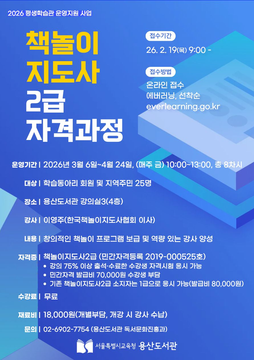 ▢ 서울특별시교육청 용산도서관(관장 박경옥)은 오는 3월 6일부터 4월 24일까지 지역주민과 학습동아리 회원을 대상으로 ‘책놀이지도사2급 자격과정’을 운영한다.