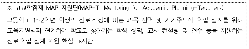 ∘ 학생들의 진로․학업설계 지도 역량 강화를 위해 ▲‘고교학점제 MAP 지원단’을 새롭게 구성하고 진로․학업 설계 지도 직무 연수Ⅰ, Ⅱ 과정을 신설하였다.