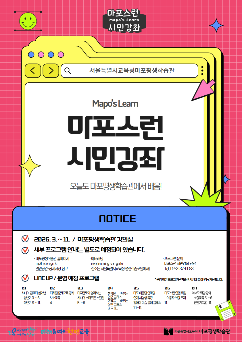 ‘마포스런(Mapo's Learn)’ 시민강좌는 2026년 3월부터 12월까지 진행되며, 자세한 일정과 참여 방법은 마포평생학습관 공식 홈페이지 및 SNS 채널을 통해 확인할 수 있다.