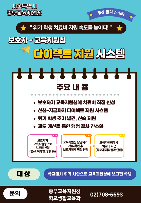 ▢ 서울특별시교육청(교육감 정근식) 산하 서울특별시중부교육지원청(교육장 최도규)은 2026년부터 학생 마음건강 위기 상황에 보다 신속하게 대응하기 위해 자살시도(자해) 학생 치료비 지원 신청 절차를 개선하고, 보호자가 교육지원청에 직접 신청할 수 있는 ‘다이렉트 지원 시스템’을 도입한다고 밝혔다.