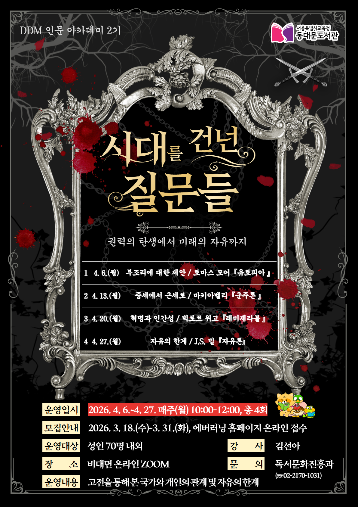 ○ 서울특별시교육청 동대문도서관(관장 전창신)은 오는 4월 6일부터 4월 27일까지 고전을 통해 현대 사회의 근간을 탐구하고 개인의 삶을 성찰하는 ‘시대를 건넌 질문들’ 강좌를 운영하며 참여자를 모집한다.