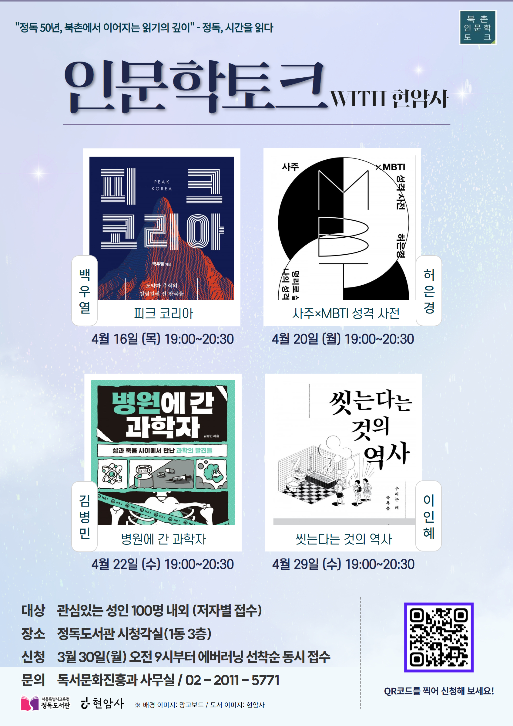 □ 4월 16일에는 백우열 작가의 『피크 코리아』를 통해 한국 사회의 현재를 진단하고, 4월 20일에는 허은경 작가의 『사주×MBTI 성격 사전』을 바탕으로 기질과 성격을 이해하는 시간을 갖는다. 이어 4월 22일에는 김병민 작가의 『병원에 간 과학자』를 통해 생명과 인간에 대한 시선을 확장하고, 4월 29일에는 이인혜 작가의 『씻는다는 것의 역사』를 통해 일상 속 문화의 의미를 살펴볼 예정이다.