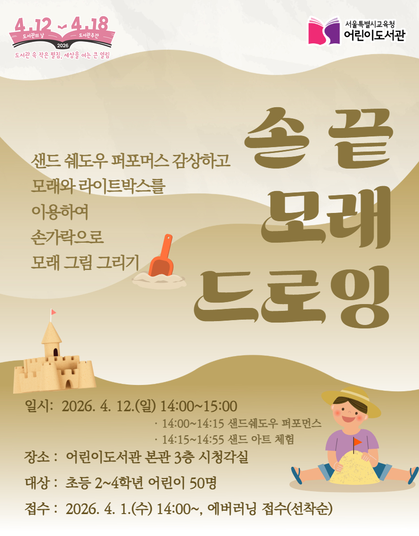 ▢서울특별시교육청어린이도서관(관장 이연미)은 도서관의 날 및 도서관 주간을 맞이하여 2026년 4월 12일(일) 14시 00분~15시00분「손 끝 모래 드로잉」를 운영한다.