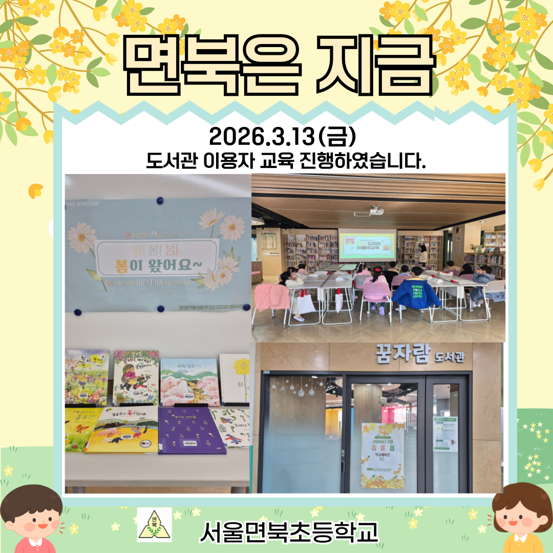 서울면북초등학교(교장 이경희)에서는 지난 3월 13일(금)에 학교생활을 시작하는 1학년 신입생들을 대상으로 ‘도서관 이용자 교육’을 진행했습니다.