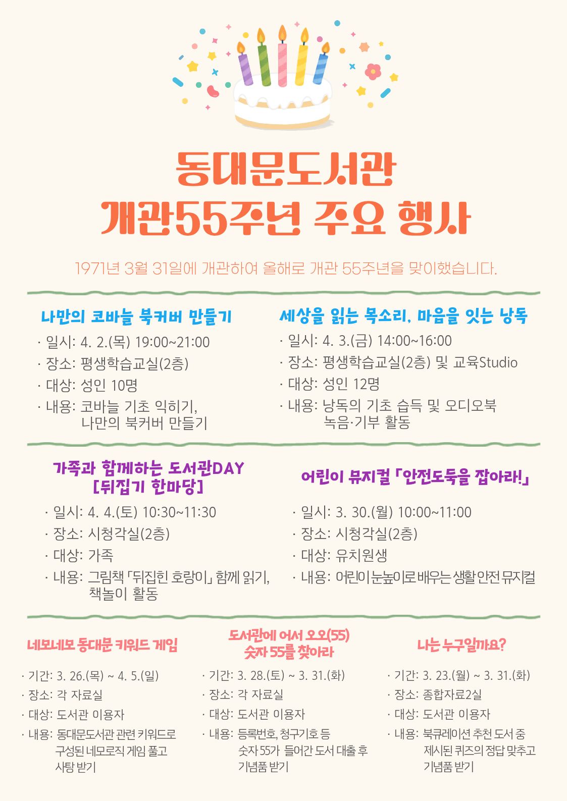 ▢주요 행사로는 어린이의 예술적 감수성을 높이는 어린이 뮤지컬 「안전도둑을 잡아라!」, 동대문도서관 관련 키워드를 활용한 네모로직 게임 「네모네모 동대문 키워드 게임」, 도서관 자료 대출시 기념품을 증정하는 「도서관에 어서 오오(55)」, 「숫자 55를 찾아라」등이 준비되어 있다.