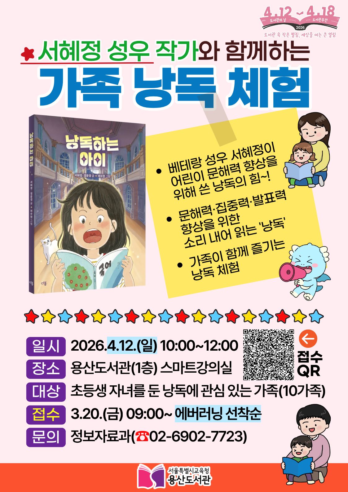 ▢ 서울특별시교육청용산도서관(관장 박경옥)은 ‘도서관의 날(4.12.)’ 및 '도서관주간(4.12.~4.18.)'을 맞아 「낭독하는 아이」 서혜정 성우 작가와 함께하는 가족 낭독 체험을 운영한다.