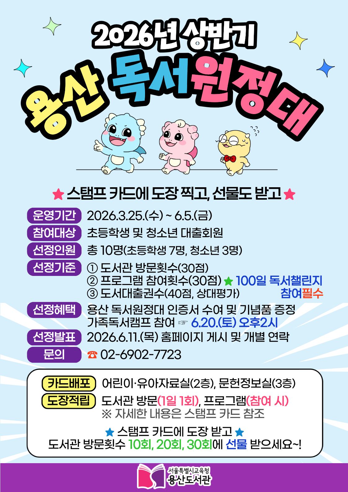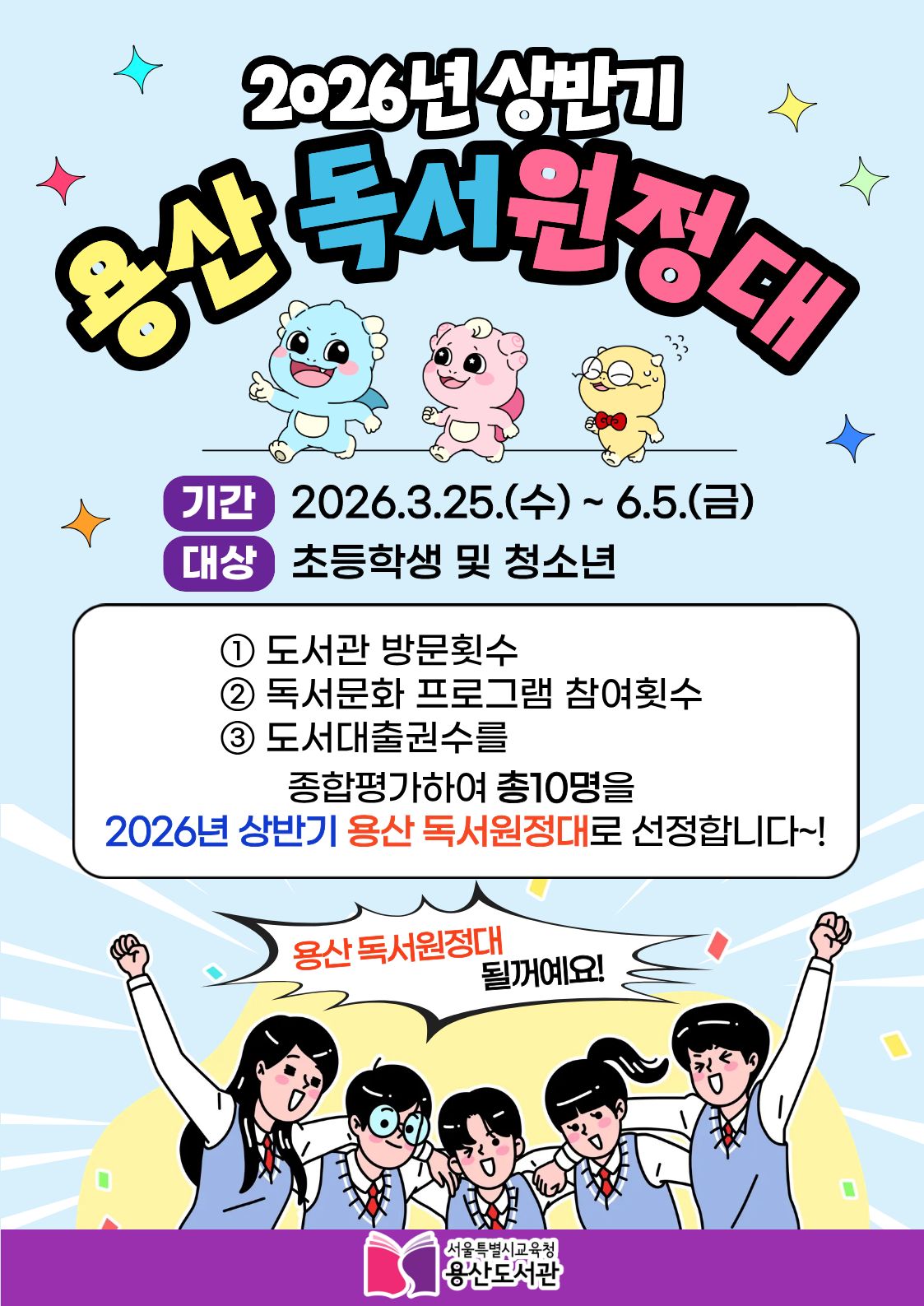 ▢ 서울특별시교육청 소속 용산도서관(관장 박경옥)은 2026년 3월 25일부터 6월 5일까지 2026년 상반기 「용산 독서원정대」를 운영한다.