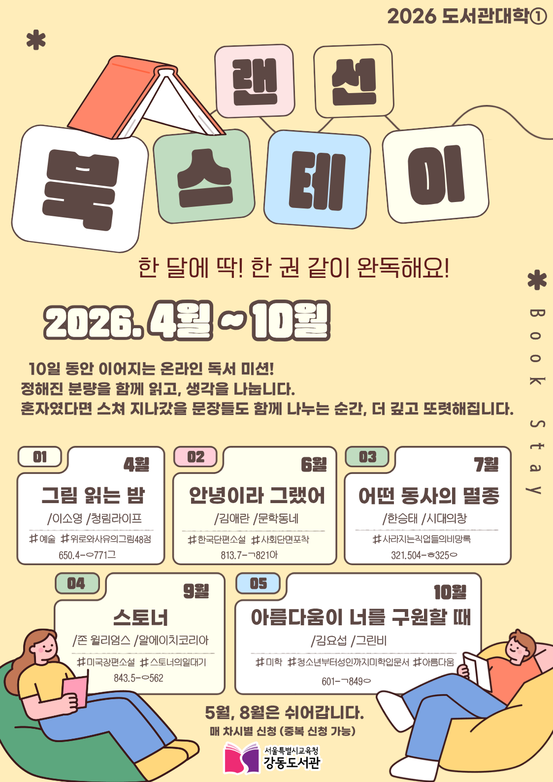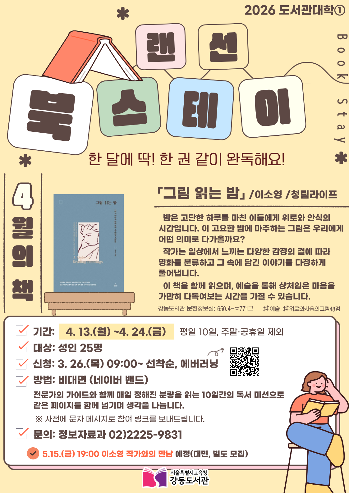 □ 서울특별시교육청강동도서관은 2026년 도서관대학 첫 프로그램으로 온라인 독서 커뮤니티 프로그램인 「강동 랜선 북(Book) 스테이」를 오는 4월부터 운영한다.