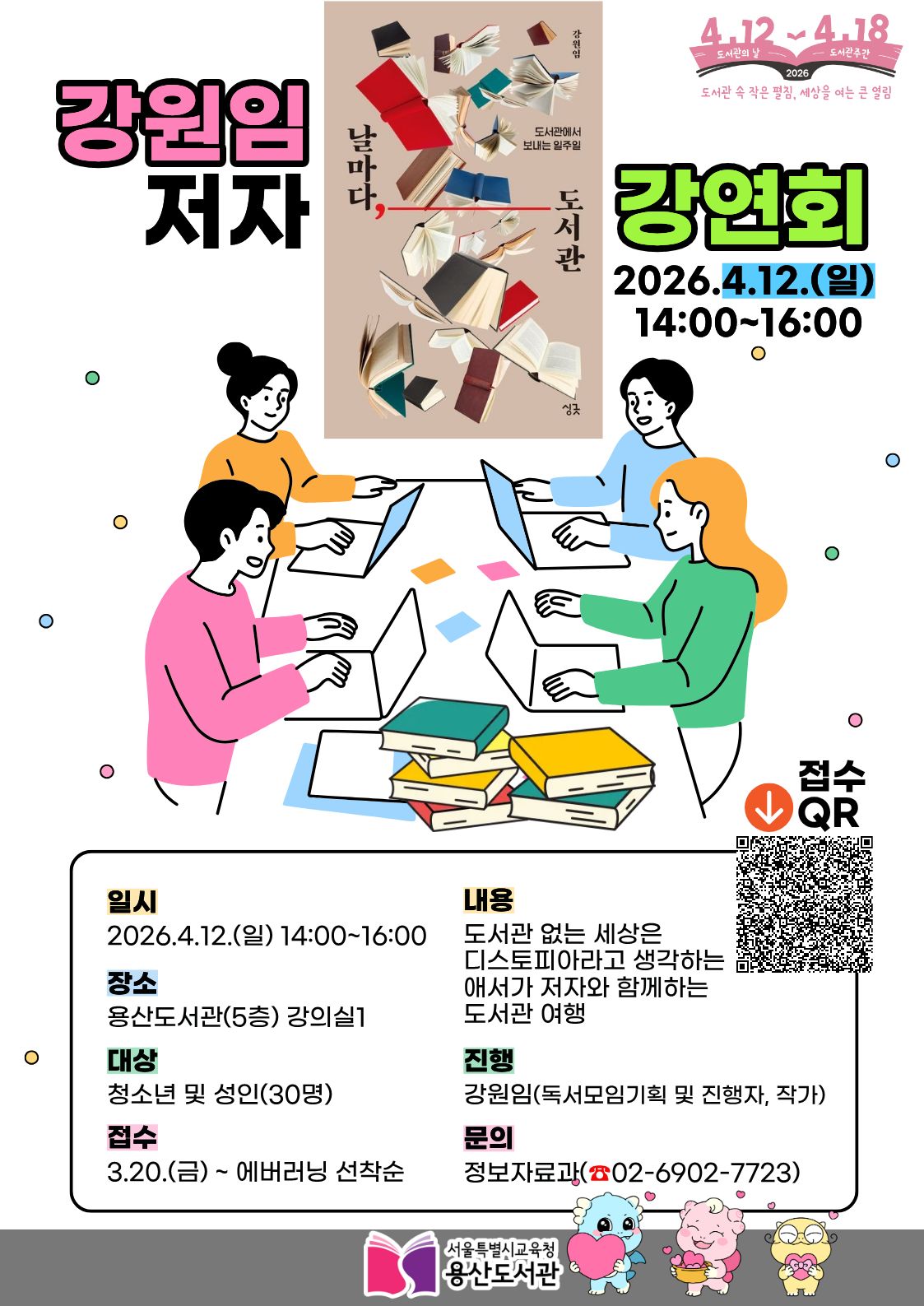 ▢ 서울특별시교육청용산도서관(관장 박경옥)은 ‘도서관의 날(4.12.)’ 및 '도서관주간(4.12.~4.18.)' 맞아 「날마다, 도서관」 강원임 저자 강연회를 운영한다.