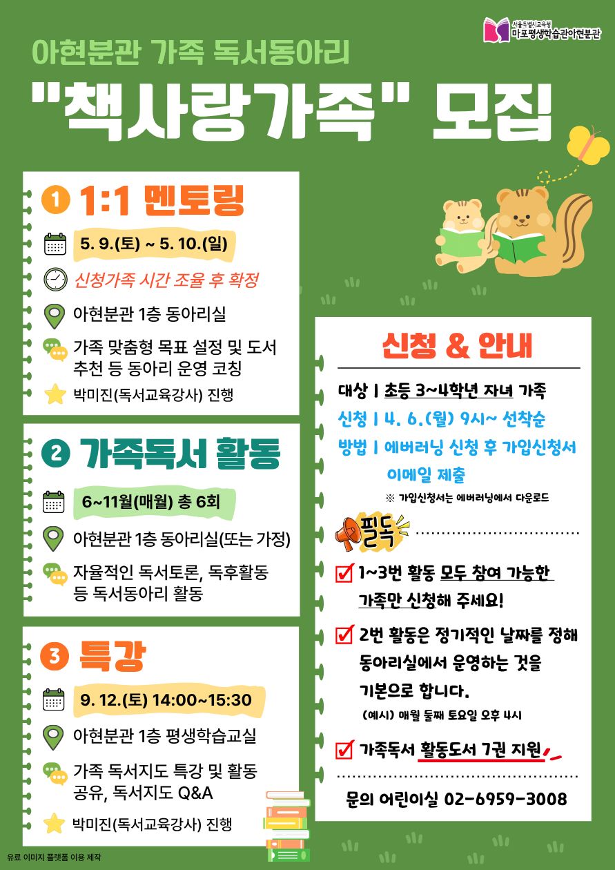 □ 아현분관 담당자는 “가족 독서동아리 활동을 통해 책을 매개로 가족 간 소통이 활발해지고, 자녀들이 독서의 즐거움을 발견하여 평생 독서습관의 토대를 마련하는 계기가 되기를 바란다.”고 밝혔다.