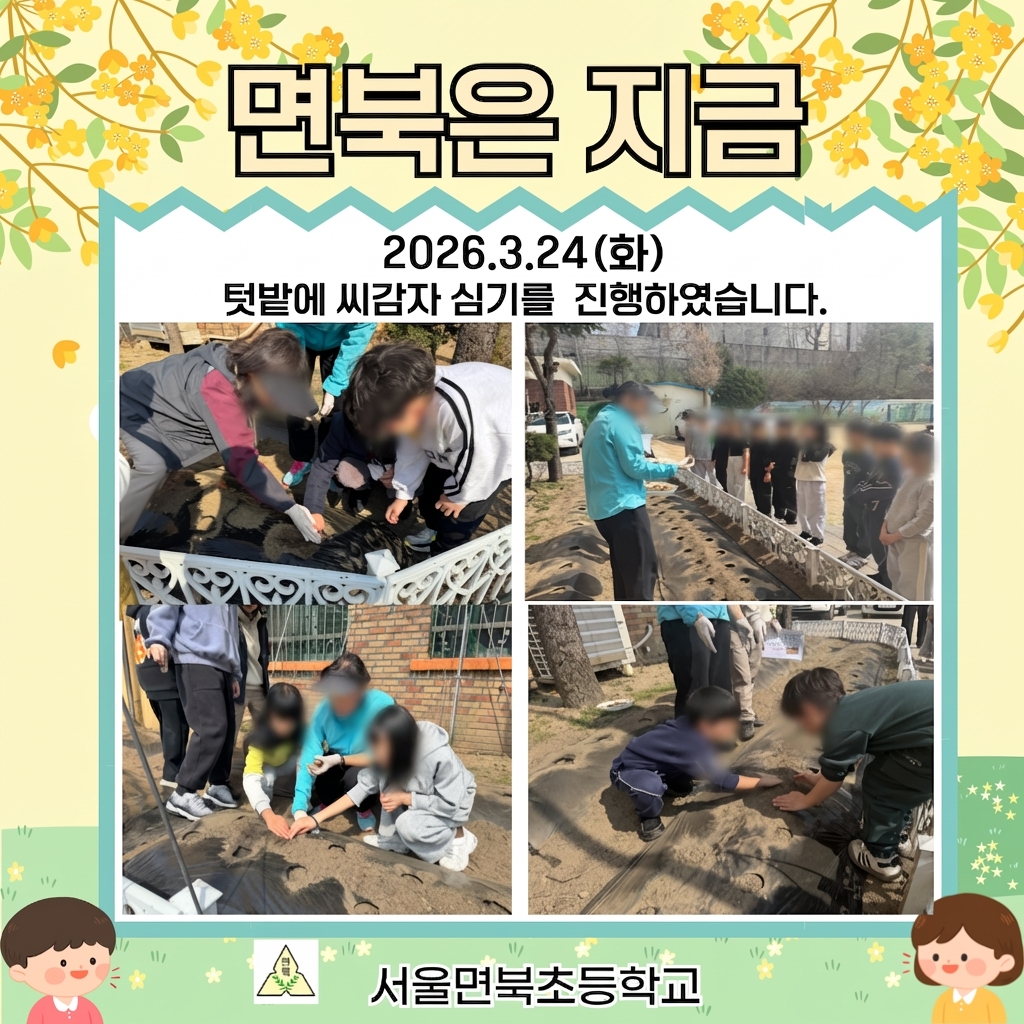 서울면북초등학교(교장 이경희)에서는 2026.3.24일(화)에 학교 텃밭에 아이들의 재잘거리는 소리와 웃음꽃으로 가득찼습니다.학생들의 생태 감수성을 기르고 노작의 즐거움을 알리기 위해 전교생을 대상으로 ‘씨감자 심기’ 생태 수업을 진행했습니다. 특히 이번 수업에는 교장 선생님과 교감 선생님께서 팔을 걷어붙이고 각 반 학생들과 함께 참여하여 눈길을 끌었습니다. 선생님들은 호미 잡는 법부터 씨감자를 심는 깊이까지 친절하게 알려주며 학생들과 눈높이를 맞추고 소통하는 뜻깊은 시간을 보냈습니다.