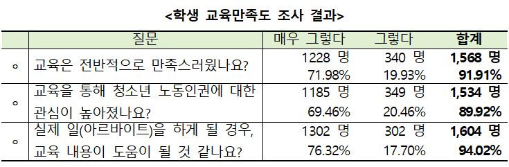 ▢ 서울시교육청은 지난해 서울지방변호사회(회장 조순열)와의 업무협약을 통해 변호사들이 직접 서울시 관내 일반고 50교를 방문하여 노동인권교육을 실시, 총 1,706명의 학생이 참여하였다.