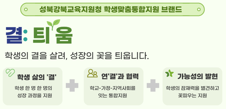 ▢ 이번 계획은 학생의 다양한 어려움과 교육환경 변화에 대응한 맞춤형 지원 필요성이 확대되는 현장의 요구를 반영해 수립되었으며, 학생 개별 특성을 고려한 통합적 지원 체계 구축의 방향을 담고 있다. 지원청은 이번 정책의 브랜드를 ‘결:틔움’으로 정하고, 학생 한 명 한 명의 ‘결’을 살려 학교와 지역의 ‘연결’을 통해 가능성을 싹 ‘틔운다’는 비전을 제시했다.