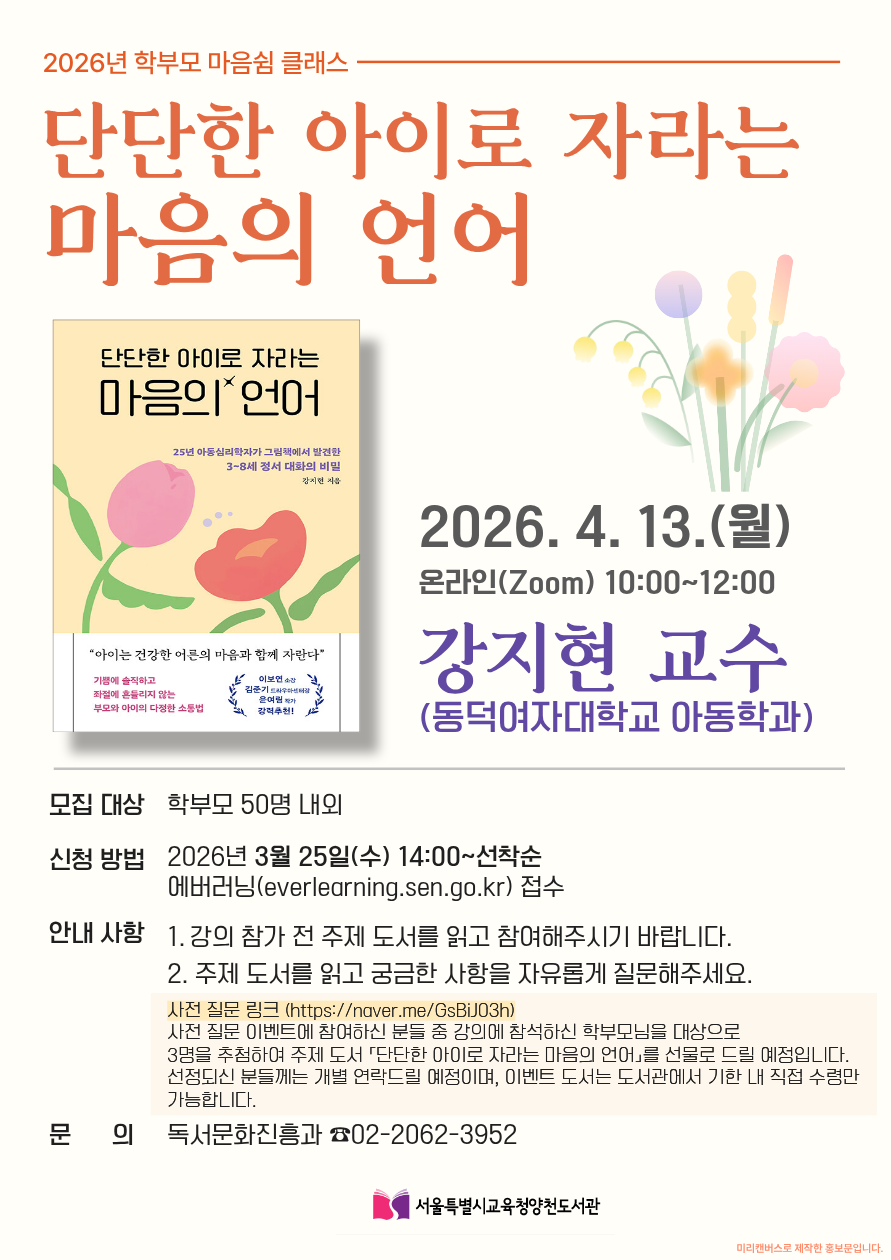 ▢ 서울특별시교육청양천도서관(관장 김덕희)은 학부모의 자녀 이해와 소통 역량 강화를 위해「단단한 아이로 자라는 마음의 언어」저자 강지현 교수를 초청하여 온라인 강연을 개최한다.