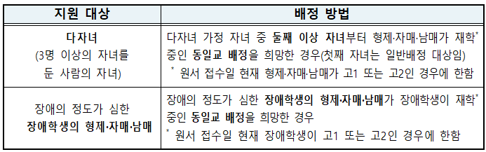 - 또한 장애의 정도가 심한 장애학생의 형제·자매·남매가 장애학생이 재학 중인 학교를 희망할 경우 동일교로 배정한다. 이는 통학과 돌봄 등에서 보호자 부담이 큰 점을 고려한 것으로, 사회적 배려 대상자 지원 확대를 통해 대상 가정의 통학·돌봄 부담이 완화되고, 학생의 안정적인 학교 생활에 기여하는 실질적인 효과가 기대된다.