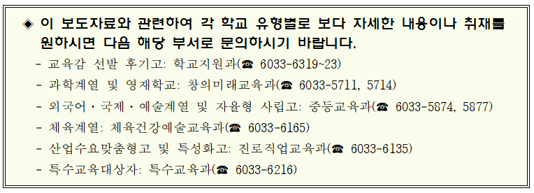 - 학교장 선발고는 교육감이 승인한 학교별 전형요강에 따라 자기주도학습전형, 실기고사, 추첨, 중학교 내신 성적 등 학교 설립 취지에 부합하는 전형으로 학생을 선발하며,