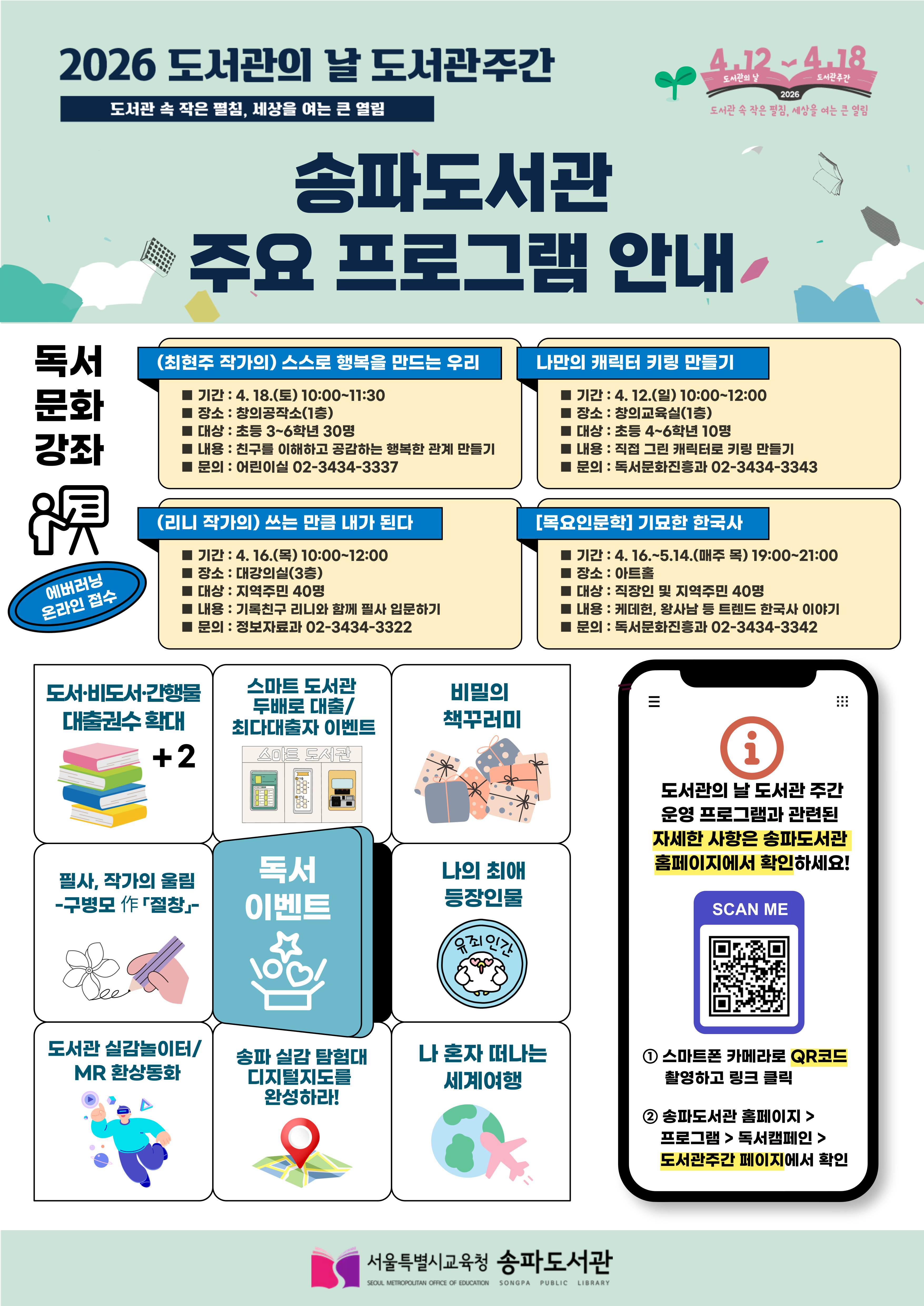▢ 서울특별시교육청송파도서관(관장 김순화)은 제4회 도서관의 날(4.12.)·제62회 도서관주간(4.12.~4.18.)을 맞이하여 「도서관 속 작은 펼침, 세상을 여는 큰 열림」을 주제로 저자와의 만남, 대출권수 확대 이벤트, 각종 전시 등 다양한 독서문화 프로그램을 운영한다.
