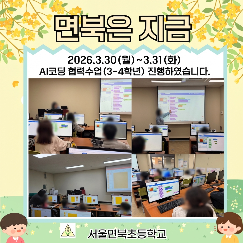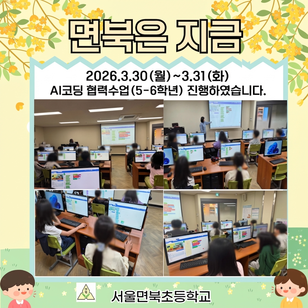 서울 면북초등학교(교장 이경희)에서는 2026.3.30(월)~3.31(화) 3~6학년 학생들은 'AI 코딩 협력수업'에 참여하여 미래 핵심 역량을 키웠습니다.